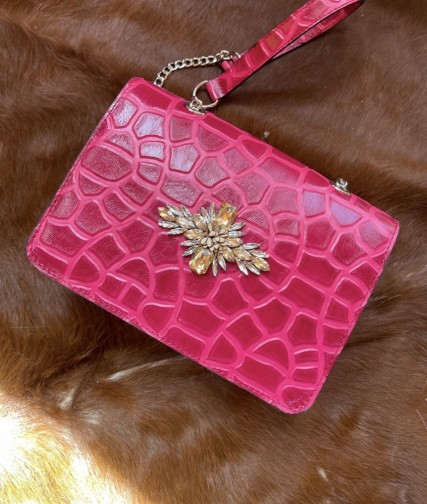 Bag jewelry leather croco pink fushia with rhinestones silver & gold color with half metal chain & leather handmade size: 23/15cm