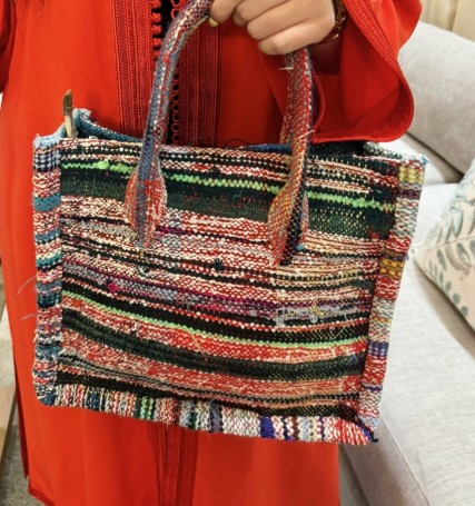 Rug bag with strays red black white light blue with handle & shoulder trap size: longueur 26cm/ largeur 29cm